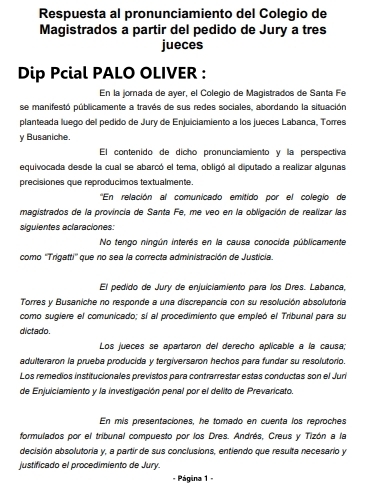 Respuesta del Dip Palo Oliver al pronunciamiento del Colegio de Magistrados a partir del pedido de Jury a tres jueces.
