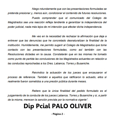 ULTIMO MOMENTO: Respuesta del Dip PALO OLIVER al pronunciamiento del Colegio de Magistrados a partir de su pedido de Jury a tres jueces.